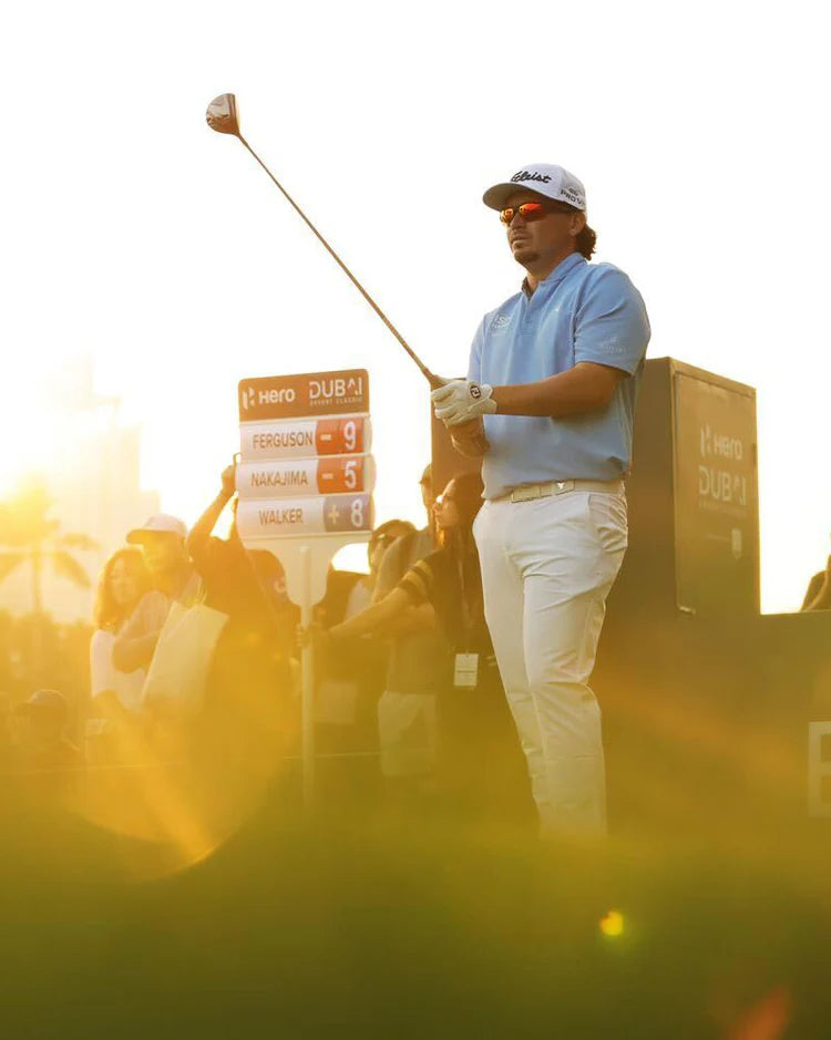 Ewan Ferguson in the Heath Bomber Shirt and the Links Bone White Tech Trouser on the Dubai Desert Classic - DP World Tour.