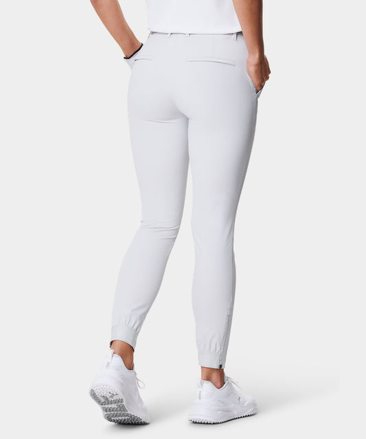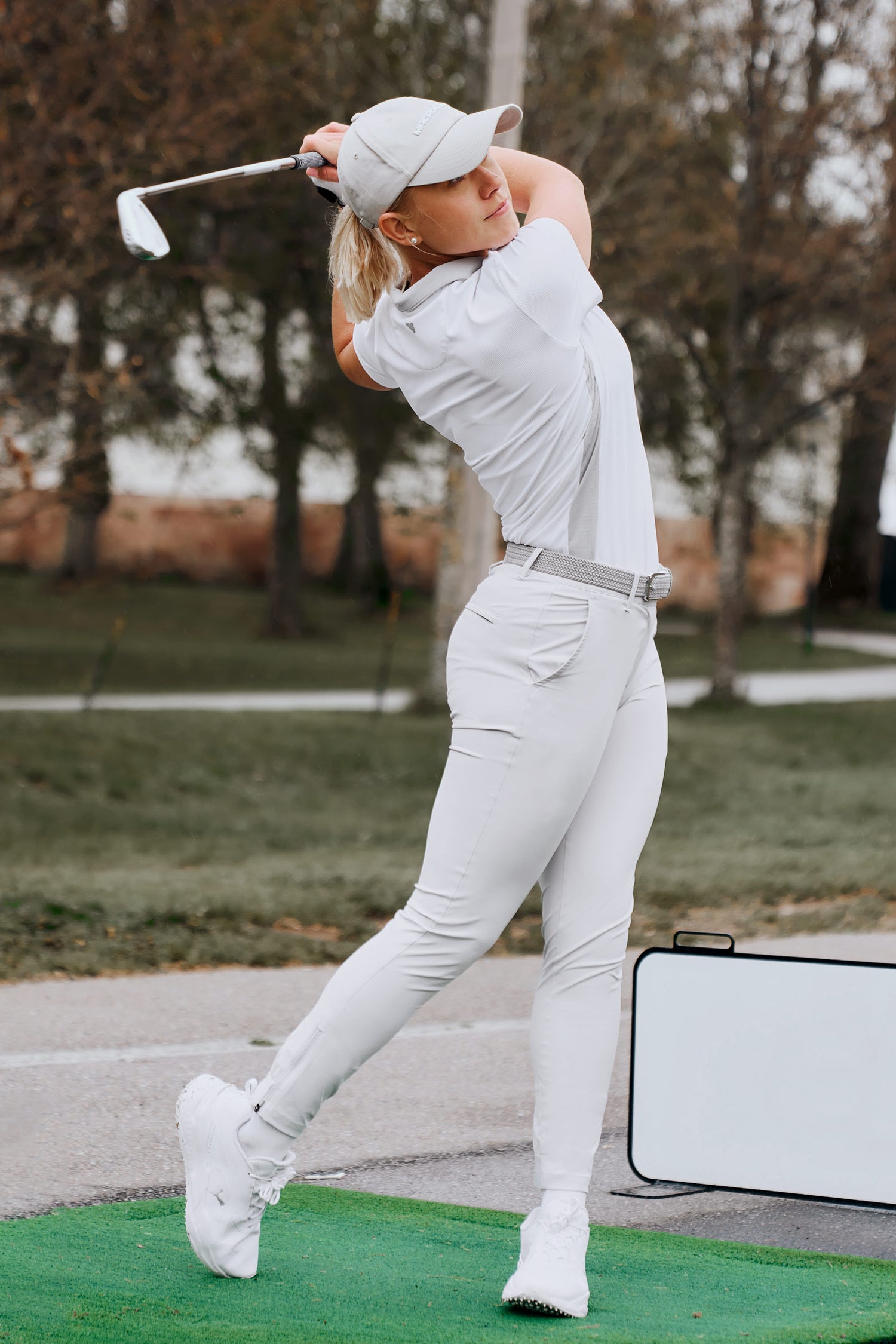 Elina wears the Tori Polo Shirt and the Four-Way Stretch Joggers on the range.