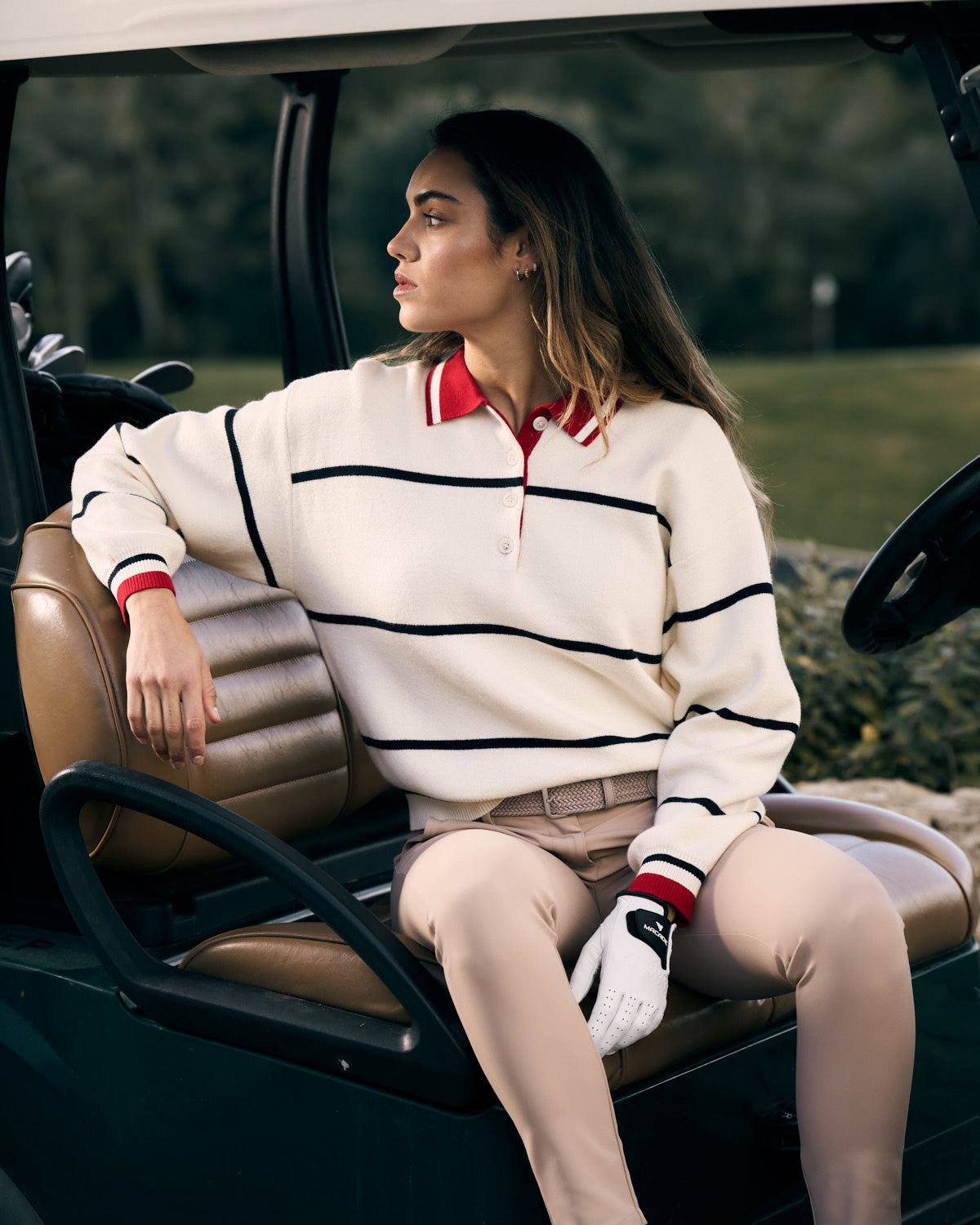A buttonless polo utilizing stretch, comfortable fabrics designed to handle performance demands while maintaining a refined, clubhouse-ready style. Subtle horizontal lines add a touch of sophistication to the overall look. Perfect for post-round socializing at your favorite club, where timeless style sets the standard.