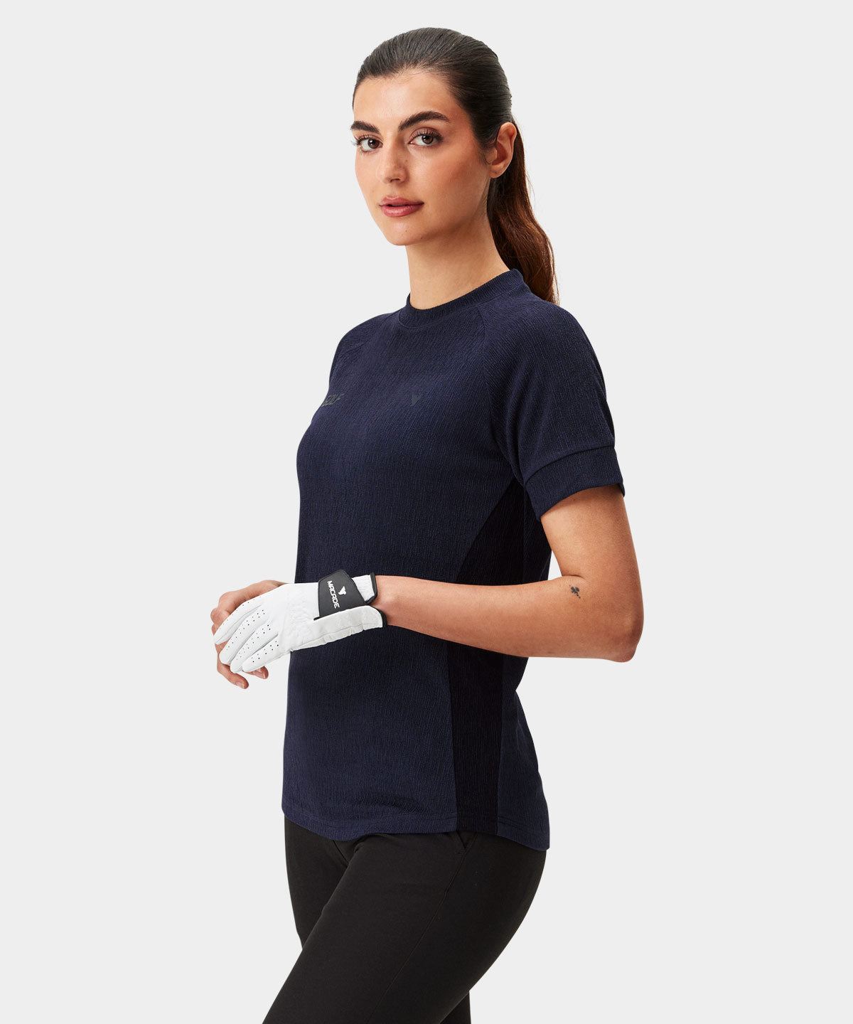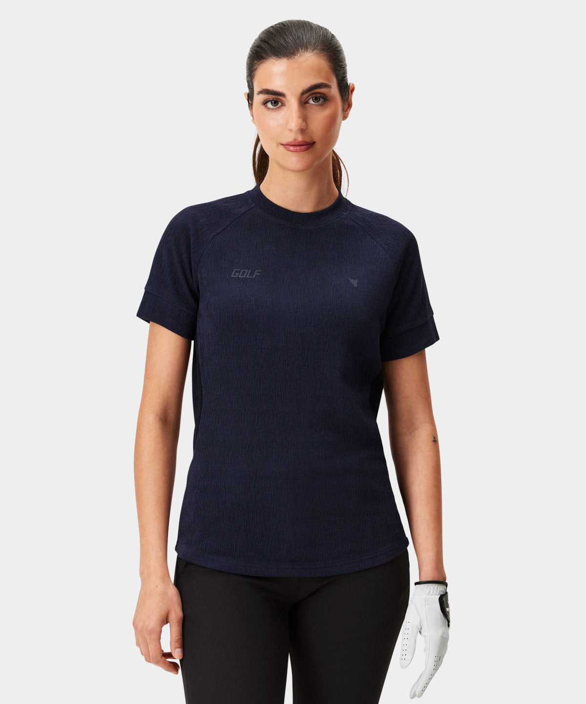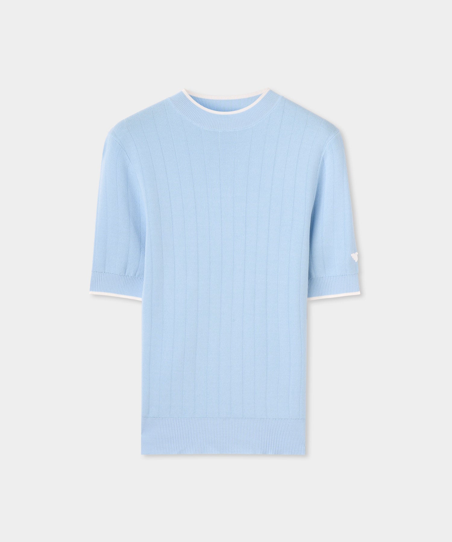 A short sleeve knit top with a subtle wave-textured surface and contrast detailing. The fabric feels soft yet structured, giving a neat silhouette. An easy option for warm days on the course or casual clubhouse wear.