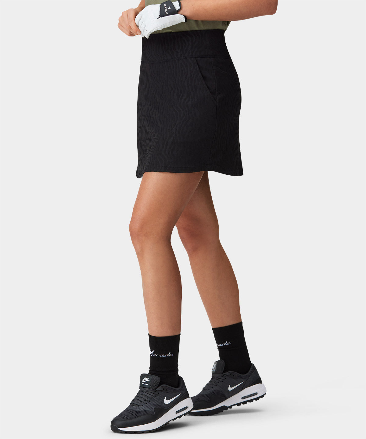 A clean performance skort with a smooth technical surface and a sharp, minimal silhouette. The stretch fabric feels light and supportive, designed to sit neatly at the waist with an easy, athletic drape. A dependable warm-weather piece for course days and club practice.