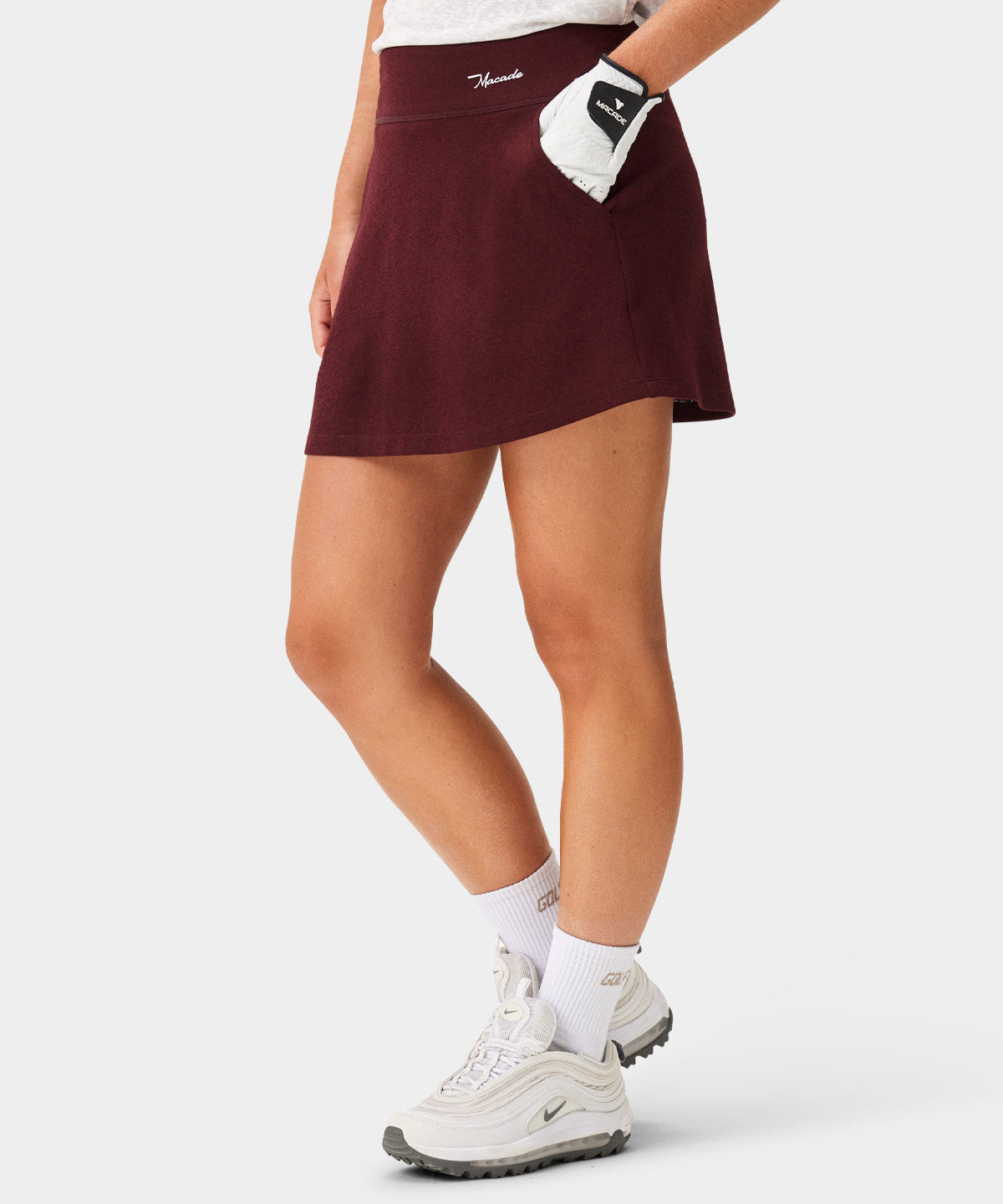 A clean performance skort with a smooth technical surface and a sharp, minimal silhouette. The stretch fabric feels light and supportive, designed to sit neatly at the waist with an easy, athletic drape. A dependable warm-weather piece for course days and club practice.
