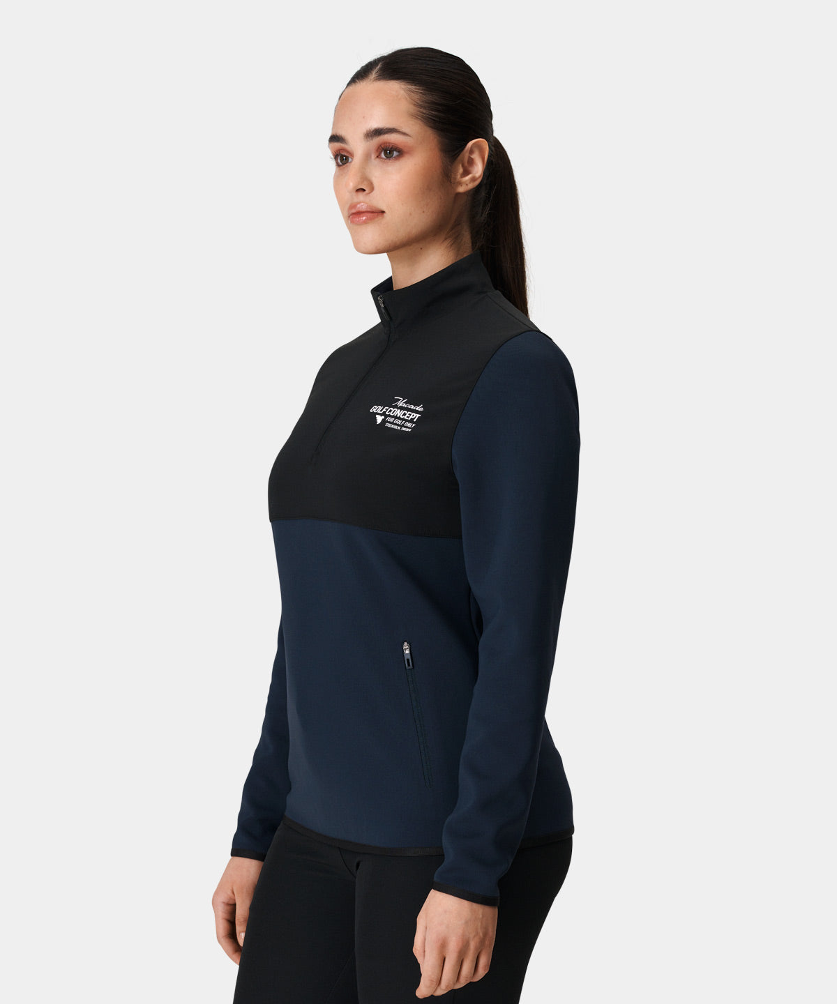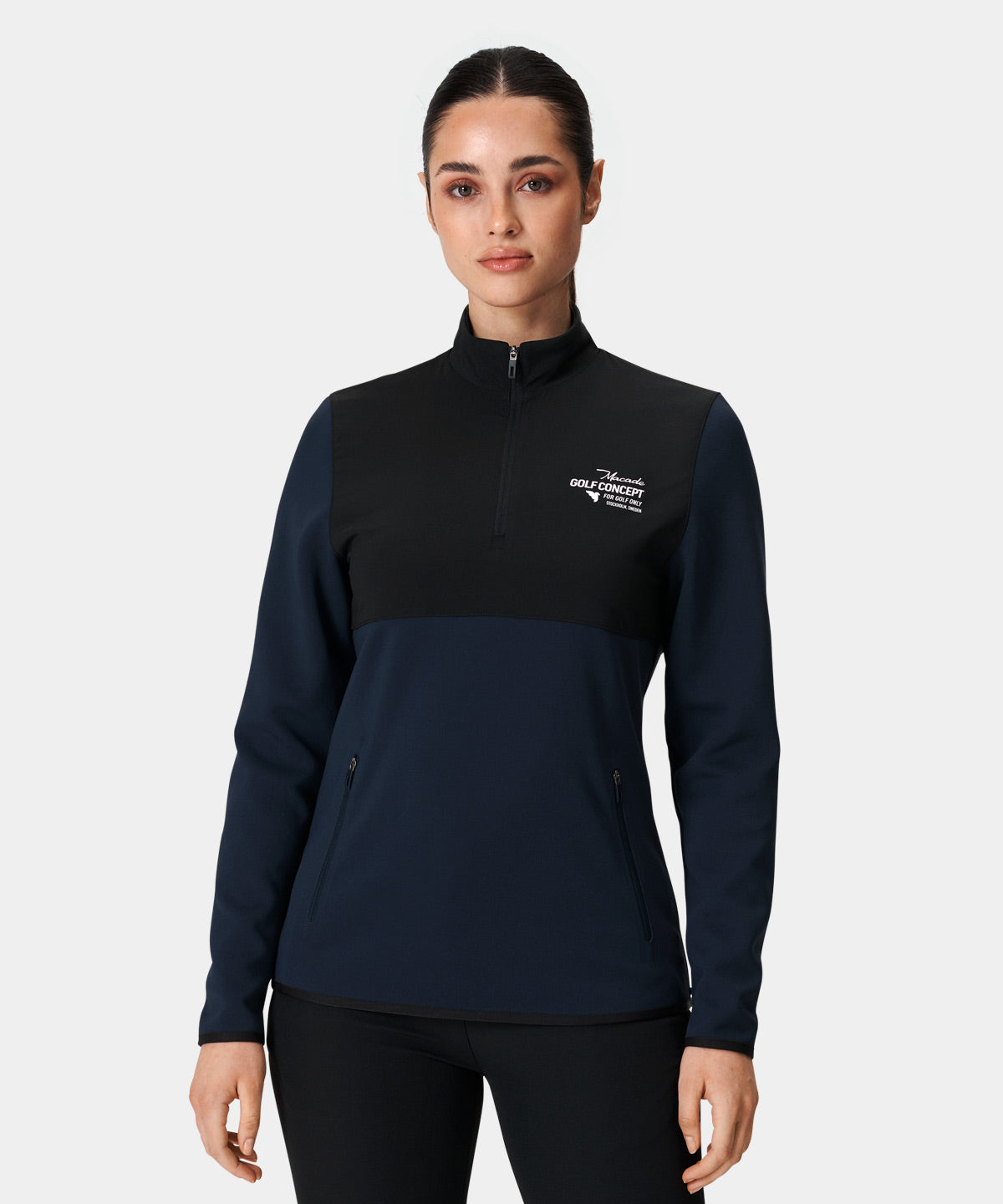 This dark blue short sleeve shirt features an open v-neckline, contrasting cuffs and rounded hem for a flattering drape. It is made from a lightweight four-way stretch fabric that is breathable and moisture wicking to keep you dry and comfortable during a full 18.
