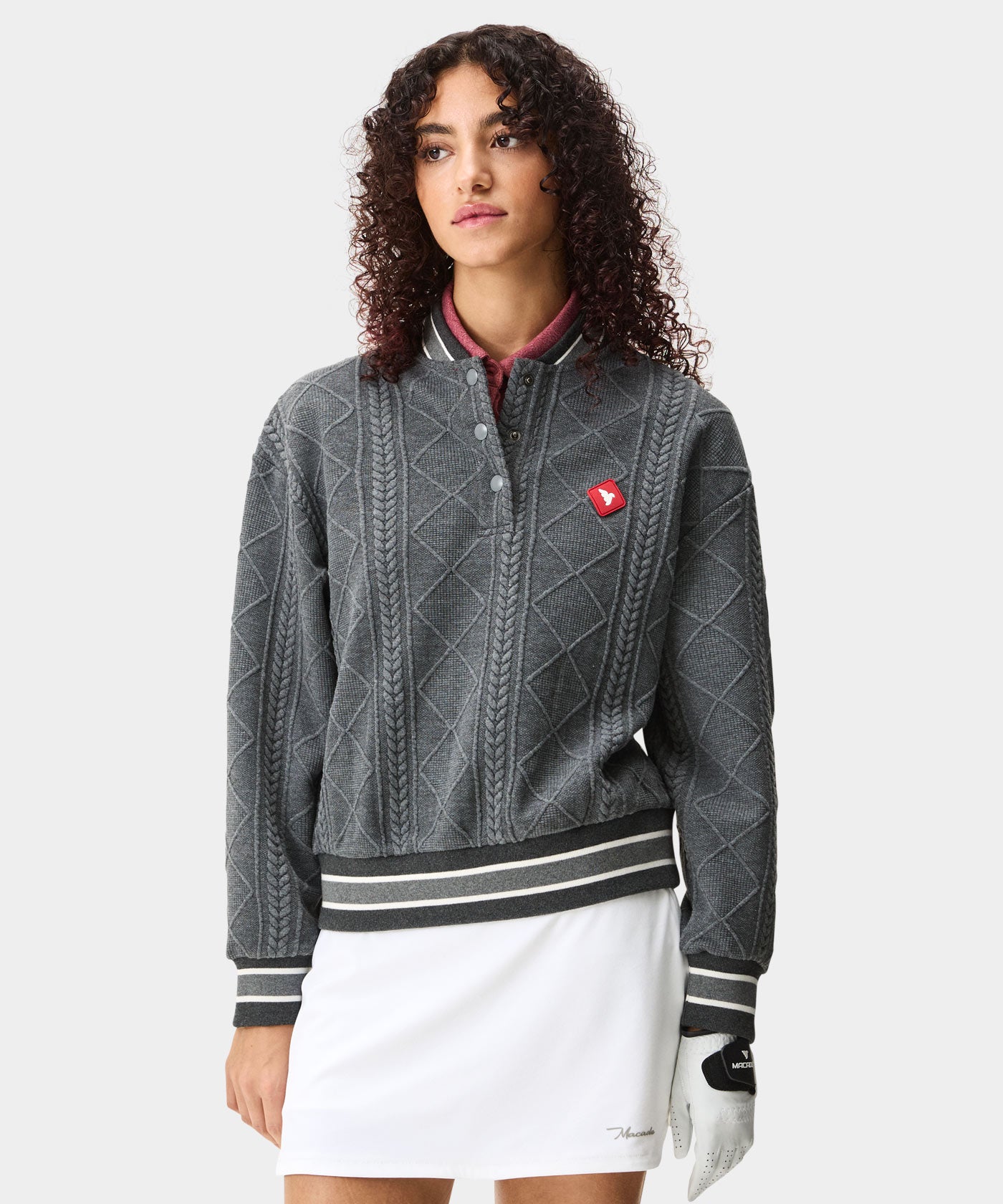 A modern update to a timeless course staple. Crafted from a lightweight jacquard fabric with a subtle geometric pattern, it offers a breathable, textured feel that elevates classic performance wear. The structured collar and clean placket deliver a refined look, while the signature red chest patch adds a confident finishing touch. Designed for stretch, comfort, and sophistication, transitioning seamlessly from fairway to clubhouse.