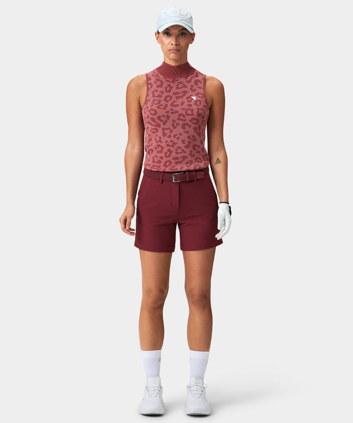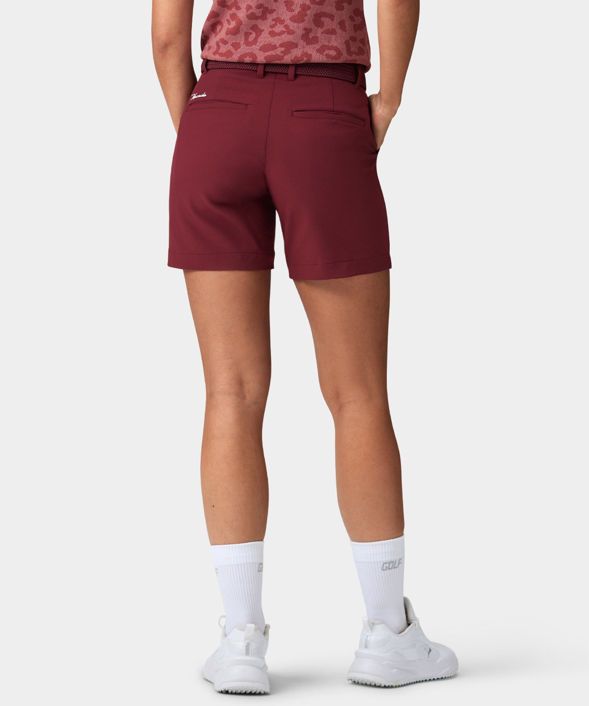These wine colored shorts are made from a soft, stretchy woven fabric and come with a high waist and short leg design for a more contoured and form fitting look. The elasticated waistband is equipped with a silicone gel lining to keep your shirt neatly into place. Plus front and back pockets to hold all your golfing accessories.